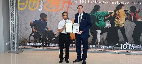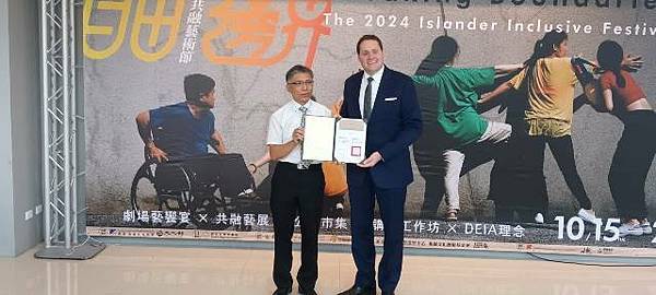 文化局林韋旭副局長也特別頒發感謝狀,給美國在台協會高雄分處張子霖處長(Neil H. Gibson),感謝協會慷慨解囊支持滯留島推廣文化平權;並且感謝臺南市政府社會局,協助提供復康巴士,讓身心障礙舞者可以順利參與排練及演出;同時也感謝國立臺南特殊教育學校、蘆葦啟智中心、財團法人臺南市和通文化藝術基金會、行無礙資源推廣協會、美善社會福利基金會及臺南社區大學台江分校等單位,透過擴大社會參與,讓更多民眾認識文化平權的重要性。