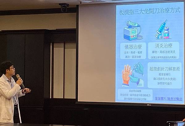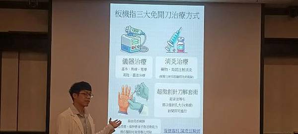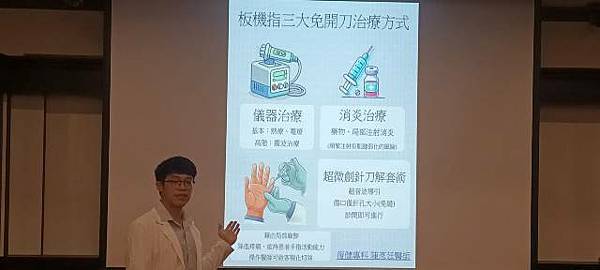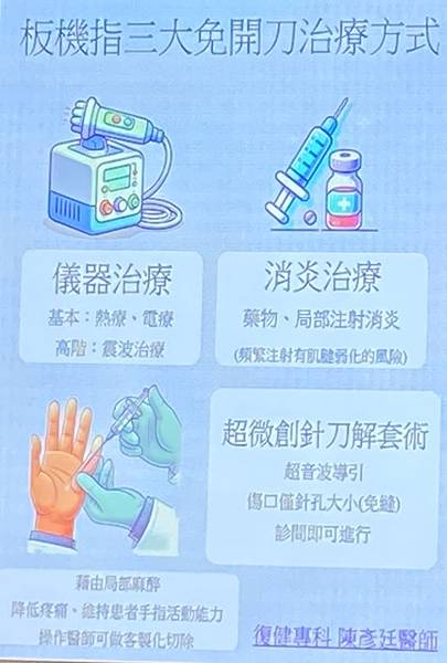 1.超音波、石蠟浴、震波等儀器治療來軟化肥厚的腱鞘或肌腱