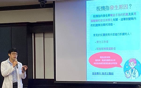 台南新樓醫院復健科陳彥廷醫師提及,板機指發生係因屈肌腱及其周圍腱鞘的發炎和厚化有關,這導致腱鞘內的肌腱無法順利滑動,這問題常見於反覆使用手部進行抓握或其他重複性動作的個人。