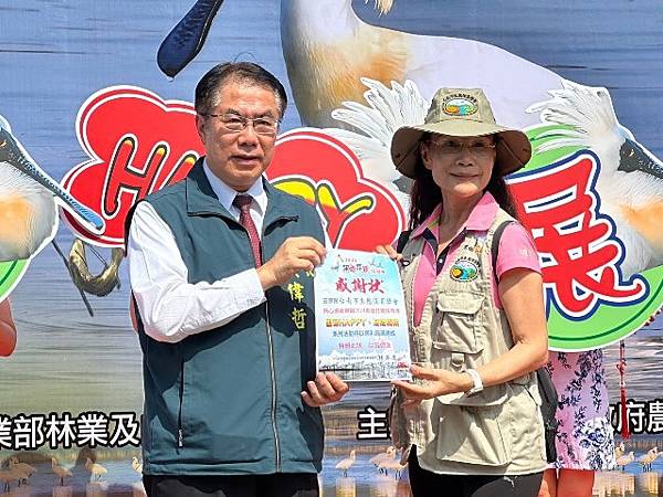 農業局代理局長陳仲杰、農業部林業及自然保育署嘉義分署長張岱、雲嘉南濱海國家風景區管理處處長許宗民等人頒獎2024黑面琵鷺保育季有功人員團體。
