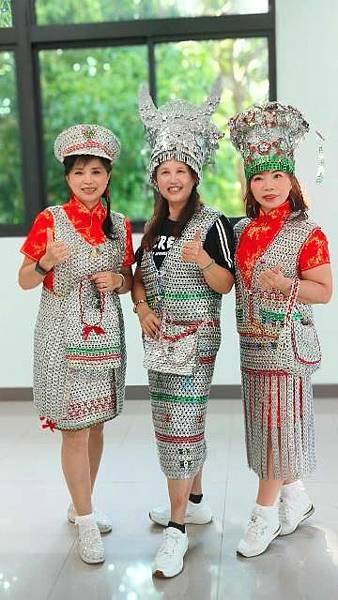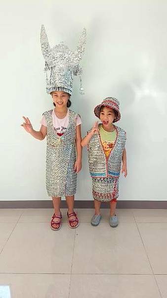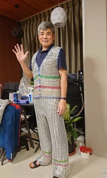 李家琦2日在市民學苑成果展,採互動方式,將拉環製做的衣裙,提供民眾免費穿拍,民眾看到鋁罐文創作品,大為驚嘆,而且歡欣穿上拉環衣服拍照,包括有拉環大衣、西裝、背心、長短裙、草裙等,大人小孩都能穿,還能全家一起穿拍,來個難忘的【琦幻之鋁】。