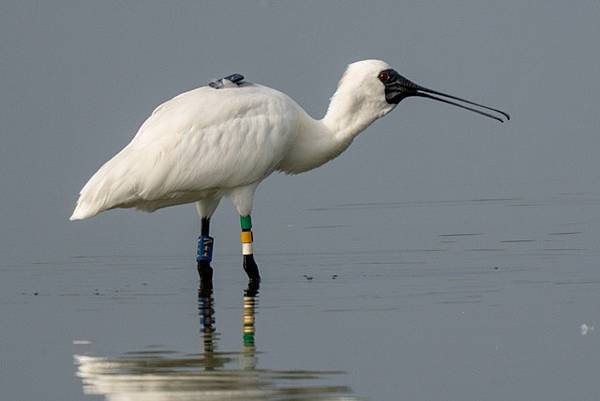 昨天上午八點多,鳥友鄭宗達在嘉義縣南布袋7區的濕地拍攝黑面琵鷺棲息覓食,意外發現其中1隻有繫掛腳環「N44」的黑面琵鷺,相當振奮。