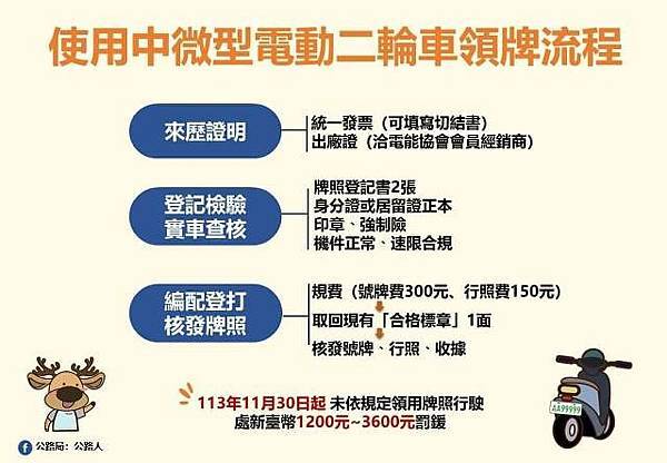 臺南監理站提醒車主及家中有使用微型電動二輪車者,儘速完成領牌,自113年11月30日起未領用牌照,騎乘微型電動二輪車,將依道路交通管理處罰條例第71條之1規定處新臺幣1,200元以上3,600元以下罰鍰,並禁止行駛。