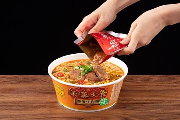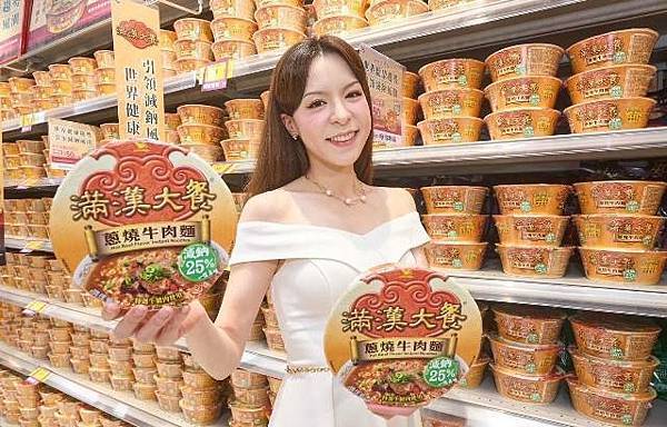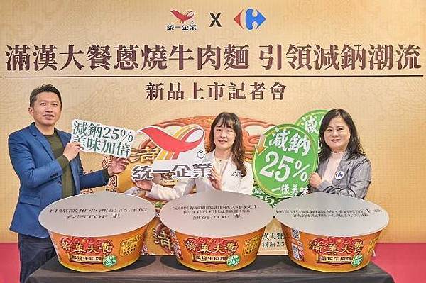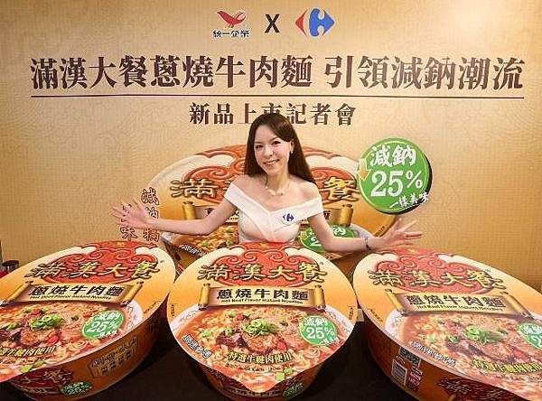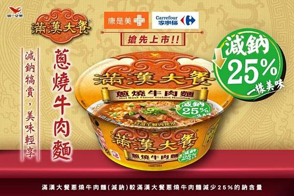 蟬聯多年家樂福料理包泡麵與牛肉麵口味熱銷第一的「滿漢大餐」,接軌國際趨勢,以最熱銷品牌蔥燒牛肉麵帶頭,推出台灣史上減鈉最多達25%的泡麵,扮演業界領頭羊之姿期望-能帶動台灣減鈉新風潮!