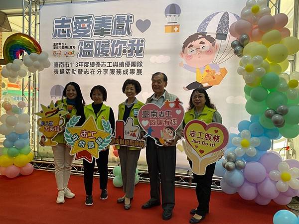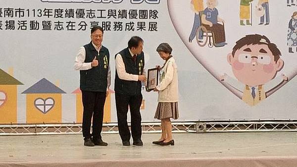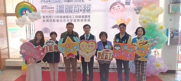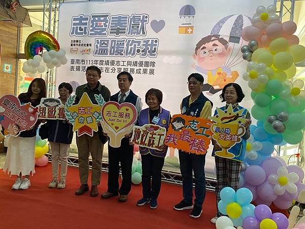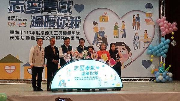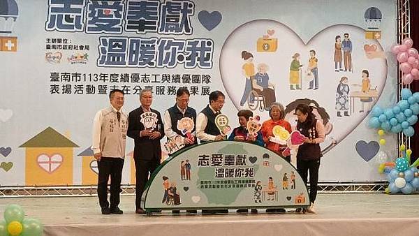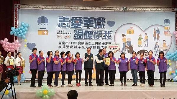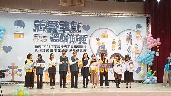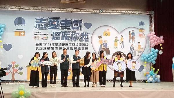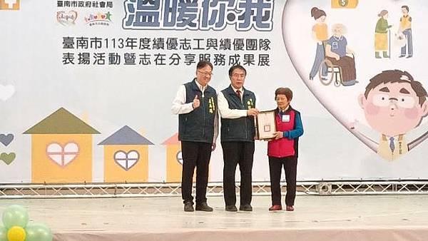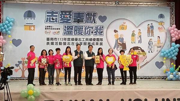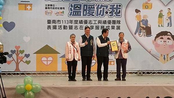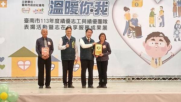 社會局長盧禹璁指出,今(113)年度同時表揚績優志工團隊、績優家庭志工及績優局處,其中績優志工團隊獲獎計4隊,分別為臺南市政府家庭暴力暨性侵害防治中心(社福類)、財團法人「張老師」基金會臺南分事務所(社福類)、臺南市立安南醫院-委託中國醫藥大學興建經營(衛生類)及衛生福利部嘉南療養院(衛生類);榮獲績優家庭志工獎有康耿山、康林春蓮(社會局)、葉惠珠、陳東炎(民政局)、張麗卿、蘇繼岳(文化局)、江進坤、吳清妹(衛生局)及王元興、廖素津(衛生局),等5組家庭志工;以及運用志工績效表現優良的績優局處,分別為環保局、民政局、地政局、工務局及財稅局,共5個局處獲獎。