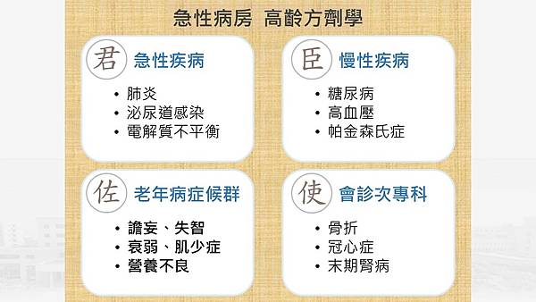 以中藥方劑學中「君臣佐使」概念,應用於住院期間的全方位照護。不僅處置急性問題,也涵蓋慢性疾患的控制、老年病症候群的評估與介入,及跨專科整合照護,都是這帖處方的必備成分。