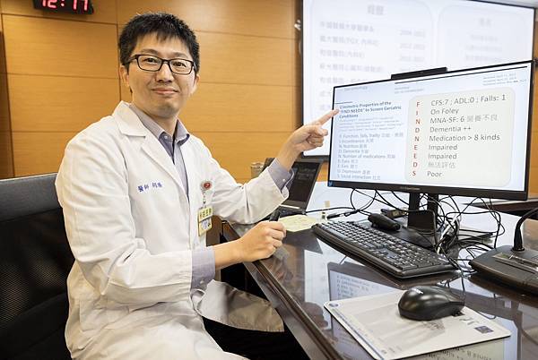 在成大醫院,團隊運用本土發展的FIND-NEEDS篩檢工具(老年問題篩檢問卷),檢視長者的功能、衰弱、跌倒、失禁、營養、失智、用藥、視力、聽力及社會活動,篩檢出有老年病症候群的長者後,進行周全性老年評估,提供合適長者更全面整合照護。而在長者的住院整合醫療中,胡昱勝醫師提出一帖「高齡方劑學」。