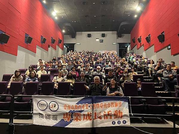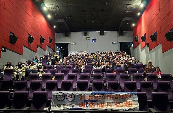 【柿子日報記者李玲/台南報導】歲末將近,為慰勞教師們一年來的辛苦,臺南市教育產業工會(下稱南教產)與臺南市教師會邀請會員教師們一起看《我的老師-首部曲:燈塔水母的秘密》電影。電影分上、下場兩場於新光影城放映,總共吸引了將近300位教師到場欣賞影片。蒞臨的來賓除了林樹橋導演及其工作團隊之外,也有許多關心教育的社會團體、家長團體與校長。分別有台南新世代扶輪社社長王國峻以及社友、臺南市安南區校長暨家長會長理事長趙飛龍、台南市家長會聯合會前理事長李孟秦、忠孝國中家長會長王鎧呈與多位校長。