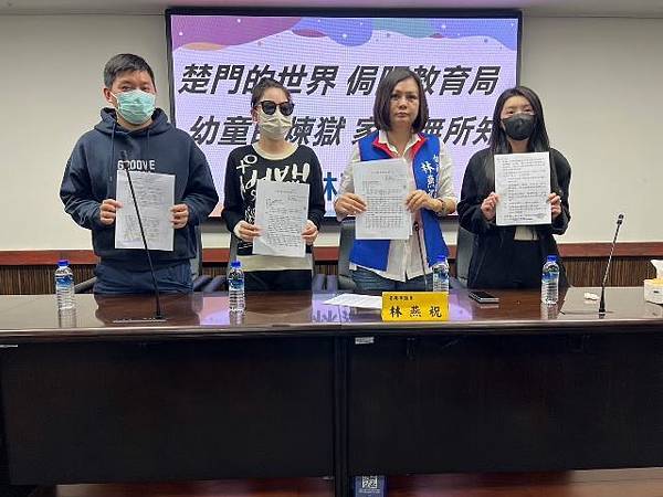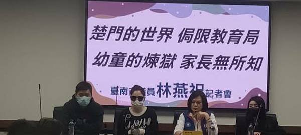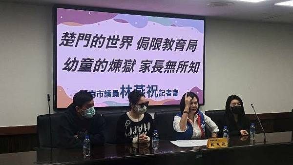 林燕祝今天請三位陳情家長和台南市府秘書長方進呈、法制處長楊璿圓、教育局副局長楊智雄、永康分局張翊雋副局長、婦幼隊長陳佩伶、政風處專員等人出席『楚門的世界、侷限的教育局、幼童的煉獄、家長無所知』記者會。