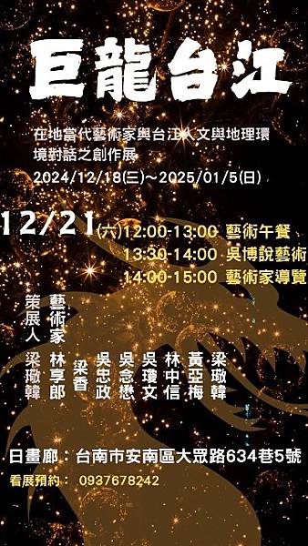 [巨龍台江]開幕式將於2024年12/21(六)中午12點舉行,屆時將有一場藝術家與觀眾的共餐活動,讓藝術愛好者與創作者面對面交流,分享靈感與創意。
