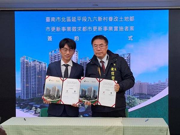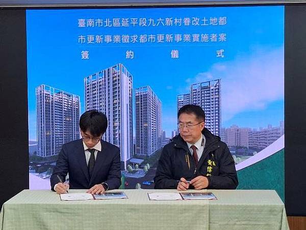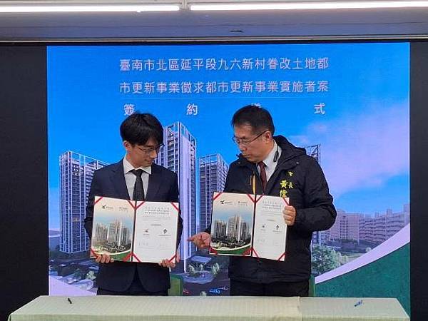 【柿子日報記者李玲/台南報導】臺南市政府配合中央政策推動土地資產活化,其中北區九六新村都市更新案成功完成招商,預計興建24層住宅大樓,完工後將取得250戶社會住宅,不僅滿足市民居住需求,亦可節省約21億元公帑。今(2)日市府於永華市政中心舉行簽約儀式,由臺南市長黃偉哲與招商得標廠商春福建設股份有限公司代表李富正總經理簽約。市議員許至椿、沈震東、陳怡珍及蔡宗豪皆到場見證。
