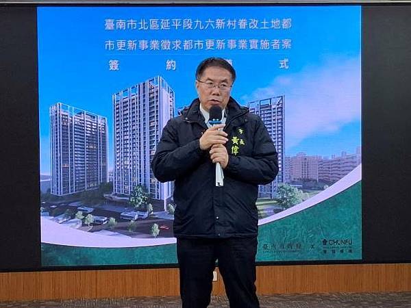 黃偉哲指出,九六新村都更案地理位置優越,居於臺南市的文化蛋黃區,周邊有臺南市美術館二館及孔廟等知名文化地標。黃偉哲強調,社會住宅已不再是遠離市區或傳統國宅的概念,而是為社會新鮮人及有需求的民眾提供便利且高品質的居住環境,他感謝春福建設以高標準興建這座社會住宅,期盼此次合作圓滿成功。