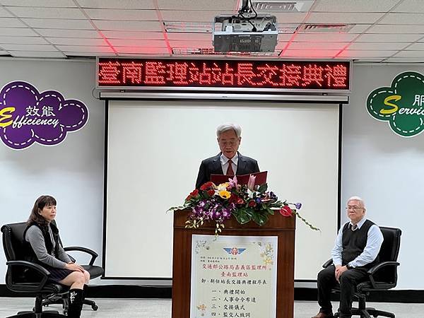所長黃萬益致詞表示,卸、新任站長都是相當優秀的公務人員,新任站長蔡義雄,具正修大學交通管理學系學士學位,曾任嘉雲區車輛行車事故鑑定會主任、公路局監理組正工程司、屏東監理站副站長、臺東監理站副站長等職務,對於車輛檢驗法令相當熟悉且經驗豐富,相信能持續提供創新、優質的服務。