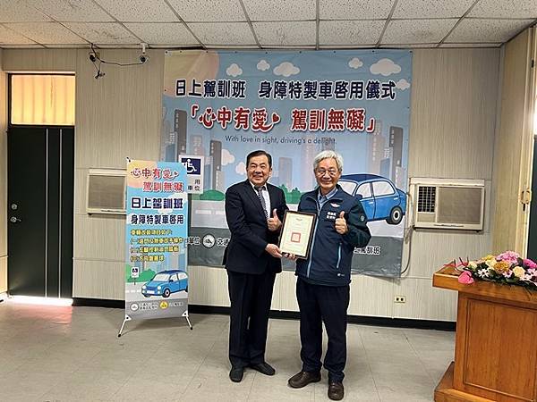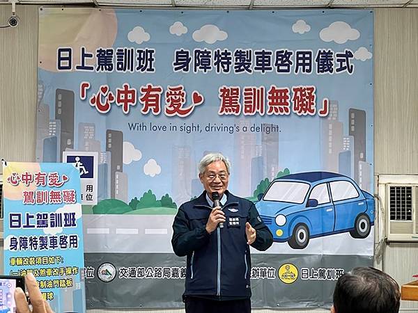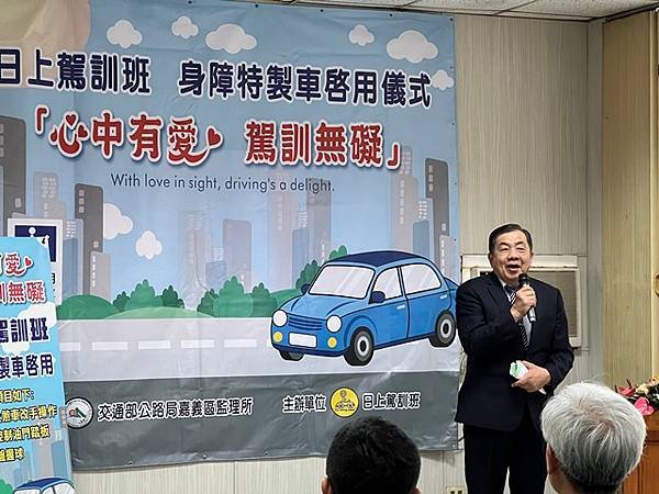 嘉義區監理所黃萬益所長表示,每位身心障礙者都應該受到平等的尊重和支持,並給予適當的環境與協助,日上駕訓班打造的特製教練車,提供肢體障礙者一個專業的訓練環境,讓有特殊需求的民眾,能和一般民眾一樣有機會學習並掌握駕駛技能,特別感謝日上駕訓班提供身心障礙者友善的訓練環境,實現「心中有愛 駕訓無礙」社會共融目標。