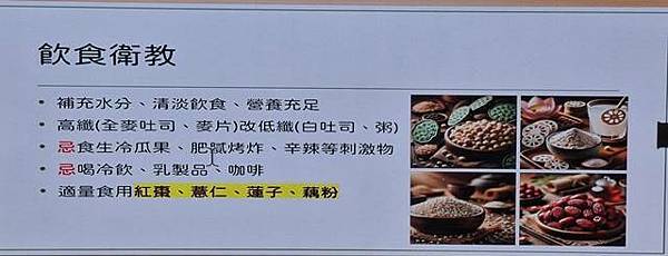 楊茲甯醫師提醒,癌症患者若有腹瀉情形,應特別注意腹部及足部保暖,避免食用生冷瓜果、油膩、辛辣與不易消化的食物,可適量攝取紅棗、薏仁、蓮子、藕粉等,有助於健脾顧胃、補氣養血及整腸緩瀉。透過適當的中醫療法與生活調整,可有效改善標靶藥物帶來的不適,提升癌症患者的生活品質。