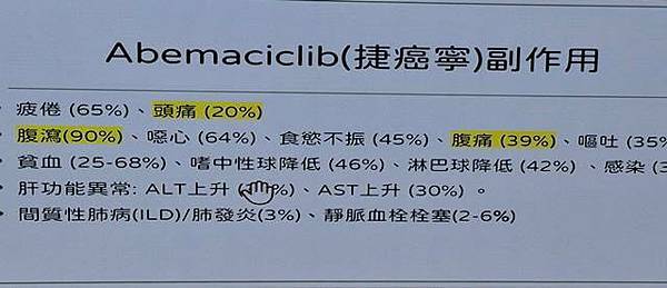 52歲的高小姐於兩年前確診乳癌三期,完成手術、化療與放療後,持續服用標靶藥物Abemaciclib(捷癌寧)及抗賀爾蒙藥物Tamoxifen(泰莫西芬)。然而,捷癌寧的常見副作用之一為腹瀉,使高小姐頻繁腹痛、腹瀉,一天多達5至6次,甚至帶有鮮血,導致身體極度虛弱,伴隨頭痛、盜汗與失眠問題。為改善這些症狀,求診台南市立醫院中醫部癌症特別門診,由楊茲甯醫師提供治療。