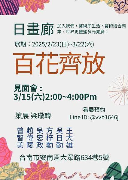 【柿子日報記者李玲/台南報導】位於台江的第一家畫廊-日畫廊:台南市安南區大眾路634巷5號,將於2/23(日)~3/22(六)展出主題[百花齊放]展覽。春暖花開,百花爭豔齊放,象徵藝術家用各式各樣多元新穎的媒材表達意念想法,花朵各自綻放。