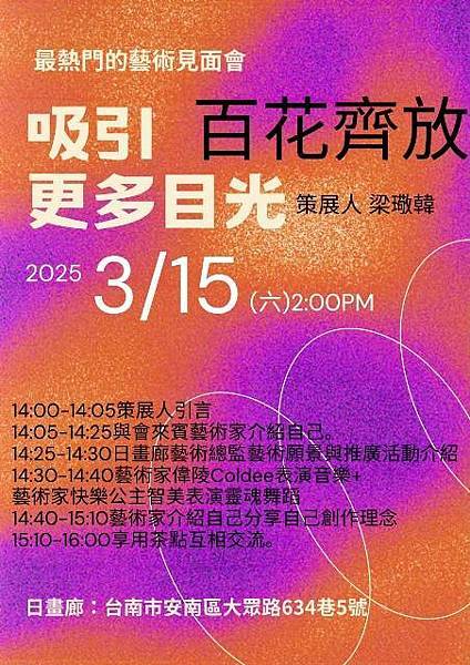 作品呼應《世界人權宣言》,強調尊重與理解是實現平等共存的關鍵。六位不同領域的藝術家3/15(六)2:00Pm舉辦一場別開生面的見面會,趙偉陵Coodee 首次將 AI 創作融入音樂表演,以展覽主題《百花齊放》為名的歌曲。作品描繪大地充滿能量、生命熱烈躍動的景象,傳遞幸福與美好的祝福。快樂公主曾智美老師也特別以AI創作的音樂現場即興舞蹈演出靈魂之舞,讓觀者更能貼近藝術家本身作品。