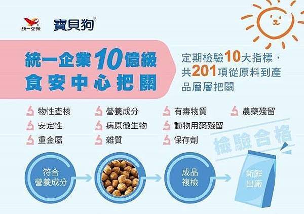 寵物公園首選寶貝狗合作,不只因為寶貝狗「Made In Taiwan」的好口碑,最大亮點在於身後有統一企業十億級食安中心做後盾,定期檢驗有毒物質、農藥殘留、重金屬、動物用藥殘留、病原微生物、雜質...等等十大指標,總計201項的繁複審查程序。尤其在去年陸續發生寵物食安事件之後,也讓寵物公園在合作飼料的選擇上,更加重視原料品質與食安檢驗的重要性,一定要讓浪孩能吃得安心、才能讓愛爸愛媽也都放心,在統一企業食安中心的把關下,寶貝狗堅守品質,提供安心、安全的營養犬食。