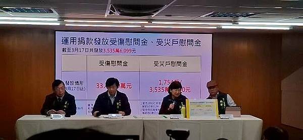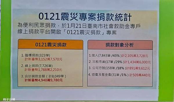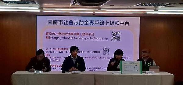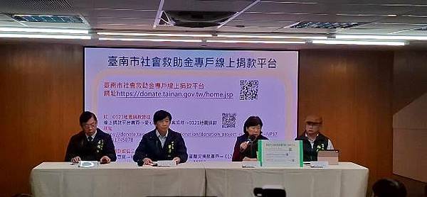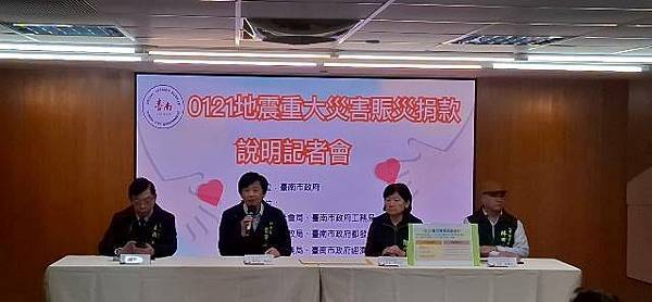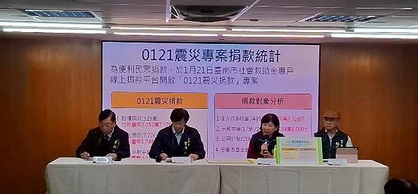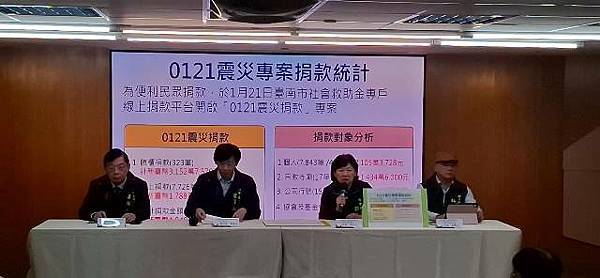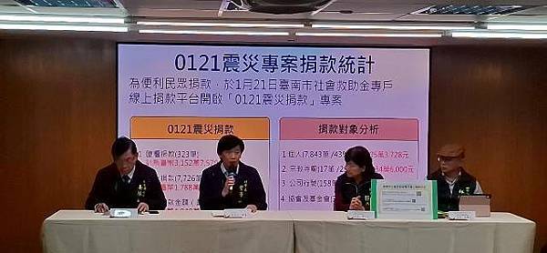社會局長郭乃文首先說明0121善款捐款情形,社會局統計截至3月17日在各界的支持下,臺南市政府0121震災捐款專案已收到超過8,000筆捐款,接近5,000萬元捐款。捐款對象中有17間寺廟捐款1,434萬元、189個公私企業及法人團體共捐款1,400萬元,其中社團法人中華安得烈慈善協會及正統鹿耳門聖母廟各捐贈300萬元,臺灣府城隍廟管理委員會、赤山龍湖巖、開基玉皇宮、財團法人台灣省台南市台灣首廟天壇、奇景光電股份有限公司各捐贈200萬元、威致鋼鐵工業股份有限公司捐贈100萬元,表達對災民的關懷與支持。