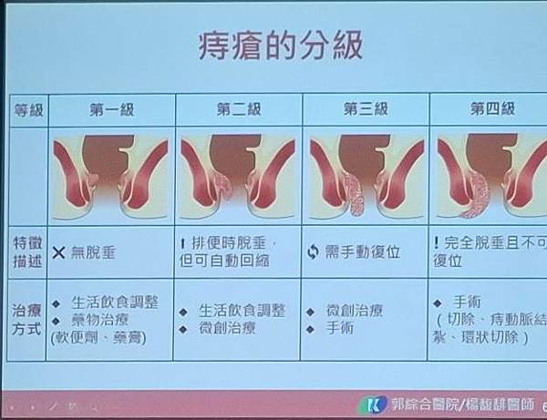 痔瘡的分類及嚴重程度分級痔瘡在解剖位置上以鋸齒線(dentate line)為分界,分為內痔、外痔及混和型痔瘡。內痔在此線以上,一般以腫脹或出血表現;外痔在此線以下,因有體表神經分佈,常見症狀為疼痛,尤其痔瘡內部血栓堆積產生痔核(thrombosis),更是疼痛難忍。痔瘡嚴重程度分為一到四級,第一級無脫垂且症狀最輕微,第二、三級雖有脫垂但尚可自動或手動復位,第四級則為完全脫垂且困難復位,同時也會合併較嚴重症狀。