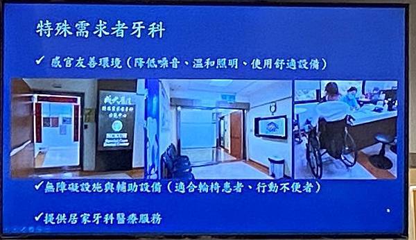 顏郁芬醫師說明,考量許多特殊需求患者對牙科環境感到緊張,成大醫院口腔醫學部特別打造感官友善的診間設計,包括無障礙空間、低刺激環境與專業設備,具備寬敞的輪椅通道、柔和燈光、低噪音設計,及可調式治療椅與鎮靜技術,幫助患者放鬆接受治療。醫療團隊也採取漸進式適應計畫,例如讓患者在未治療的情況下先熟悉診間環境,透過家屬陪伴建立對治療的信任感,並運用行為管理技巧,引導患者循序漸進地接受治療。對於長期臥床或嚴重行動不便的患者,也提供居家牙科醫療服務,讓患者能在家中獲得專業檢查與必要治療。研究顯示,這類患者的口腔健康與全身健康密切相關,透過居家牙科醫療,不僅能降低因口腔疾病導致的併發症風險,還能提升整體生活品質。