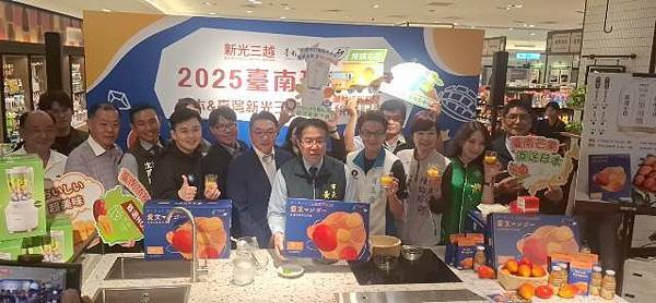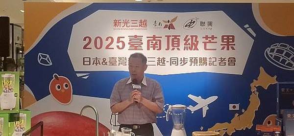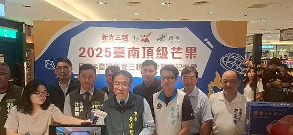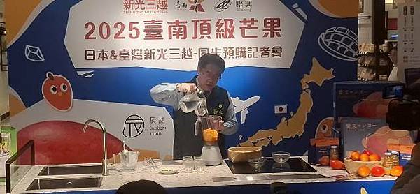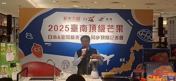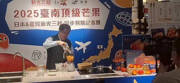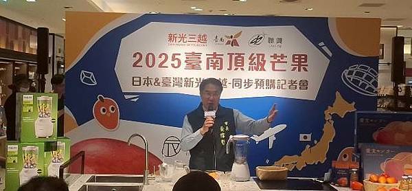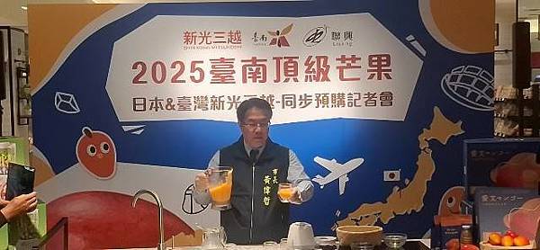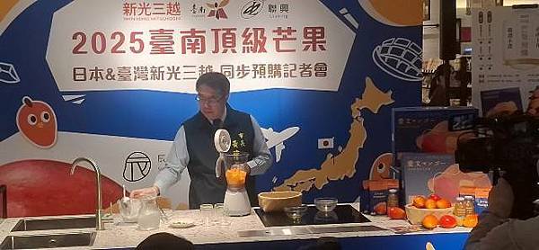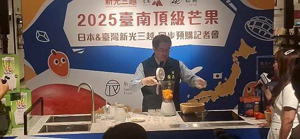 今日臺南市長黃偉哲特地出席新光三越台南新天地的「2025臺南頂級芒果-日本&臺灣新光三越-同步預購」記者會。由黃偉哲市長、玉井聯興青果生產合作社林漢維理事主席、新光三越台南新天地黃鈺翔店長及貴賓一起進行「豐芒榨現」儀式,透過鮮榨芒果汁,與現場大小朋友一同分享芒果的鮮甜,現場人潮絡繹不絕,為本次的預購直送活動熱烈開場。