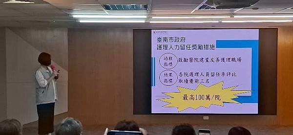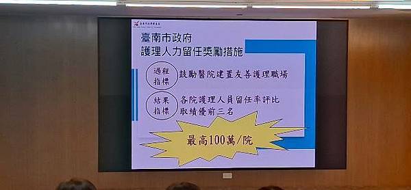 呼應中央政策精神,臺南市政府也推出具在地特色的加碼作為,啟動「醫院護理友善環境獎勵計畫」,針對本市13家急救責任醫院已執行的友善職場措施及實施後之留任成果進行評選,提供最高每院100萬元的獎勵補助,以具體資源鼓勵醫院強化職場支持系統,挽留珍貴的護理人力。