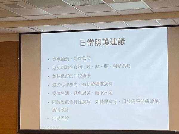 日常照護方面,建議避免辛辣食物、酒精與菸草等口腔刺激物,維持良好口腔衛生與規律作息,並定期接受口腔黏膜檢查。吳昱學醫師也提醒,若口腔反覆潰瘍、黏膜發白、刺痛或灼熱不適,應及早就醫檢查,以早期發現、妥善處理病灶。