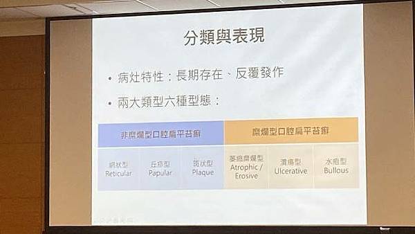成大醫院口腔醫學部吳昱學醫師說明,「口腔扁平苔癬」是一種慢性發炎的口腔黏膜病變,好發於40歲以上族群,女性略多於男性,通常為長期存在且反覆發作的病灶,臨床表現多樣,主要分為非糜爛型與糜爛型兩大類。非糜爛型病灶常呈現白色條紋或斑塊;糜爛型則會出現紅色斑塊,周圍有放射狀白線,或是潰瘍、水疱(較罕見)等型態。口腔扁平苔癬常出現在雙側頰黏膜、舌頭與牙齦,且具有對稱性分布,有時會同時出現多種型態。