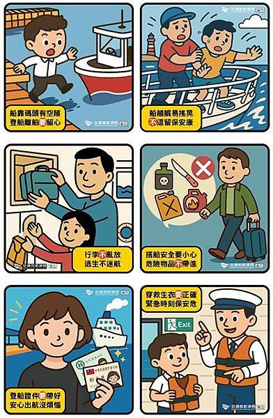 航港局表示,2025年海運安全季宣導活動已製作一系列海報、摺頁、懶人包與短影音等,透過各大交通場站、媒體及公私部門等管道推播,藉由簡明清楚的資訊傳達,讓民眾於旅途或日常生活中都能輕鬆接收最新且正確的航安資訊。藉由本次活動傳達核心理念「開船搭船多注意,快樂平安出航去」,提升民眾搭乘客船航行安全意識。