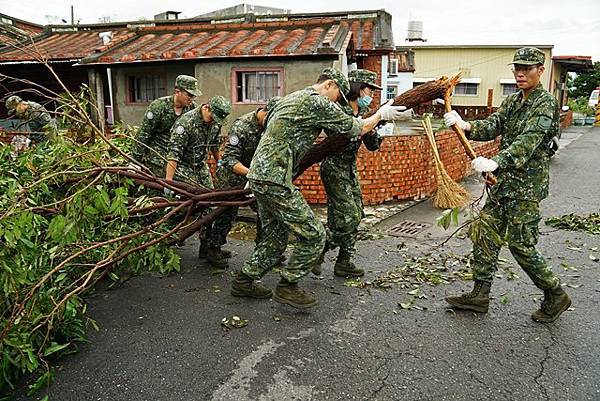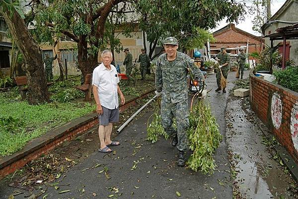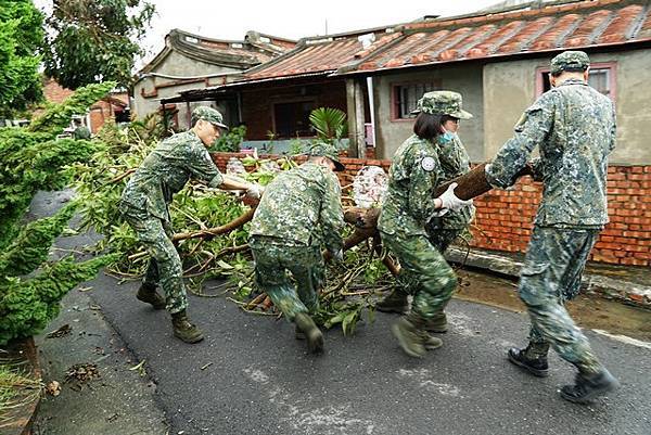 10日下午2時,長榮里謝杉里長帶領10位國軍弟兄前往現場,協力清除倒塌斷枝,並恢復周邊道路通行。在大家的通力合作下,盡速災後環境順利復原。