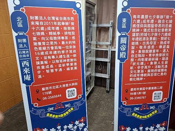 中西區開基臨水夫人媽廟則以精美的全木雕貼金教母亭為特色,隆重祈福祝壽,展現莊嚴文化傳承;北區西來庵特別為每位學子撰寫疏文並由禮生朗讀,祈願學業進步與福氣圓滿;中西區台灣臨濮堂施姓大宗祠雖歷史較短,卻嚴守古禮並對外開放,強調宗族文化與公益精神;安平開台天后宮結合傳統古禮與在地文化,儀式包含參拜媽祖、跪奉茶謝親恩、走花道、出鳥母宮等,象徵從稚子成長為有責任的成人。