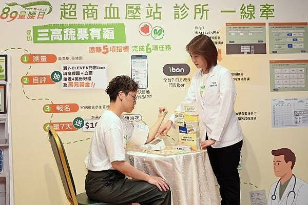 8月9日起至11月30日止,凡在全國217家7-ELEVEN血壓站量完後到ibon填答為高風險族群者,就可參加「三高蔬果有福」活動,免費列印就診任務卡,並鼓勵到鄰近合作診所就診,經醫師諮詢或進一步改善指標,便可回到門市領取免費蔬果幫助預防三高,最高可領取550元免費蔬果兌換券,品項含沙拉26項、水果19項、蔬菜46項供就民眾選擇。而8月9日當天上午217家7-ELEVEN千禧血壓站門市也會同步幫民眾量血壓、腰圍,示範如何填寫ibon自評表。當天參加活動者,除現場就可帶走一包青菜及水果外,還可抽400份健康飲品及萬元黃金。