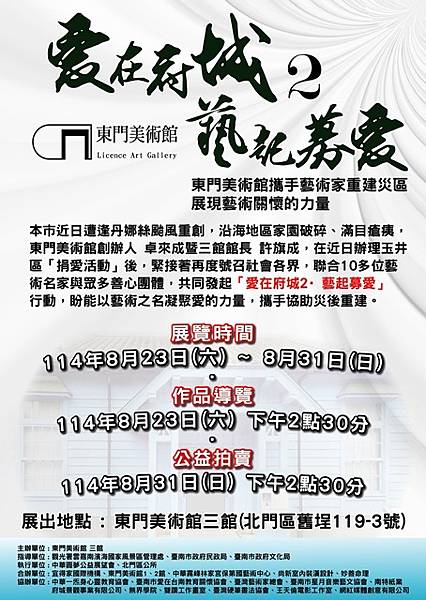 本次活動由東門美術館3館發起,廣邀各領域15位藝術創作者共同響應,延續創辦人「愛在府城」的藝術公益精神。展出作品涵蓋水墨、油畫、陶藝等多元媒材,吸引企業界人士及在地民眾熱情參與。現場除藝術品展示外,也同步舉行義賣義購,民眾反應踴躍,氣氛感人,為今年父親節增添一份格外有意義的祝福。