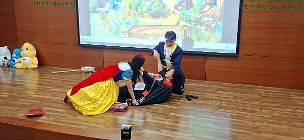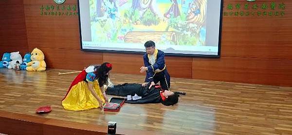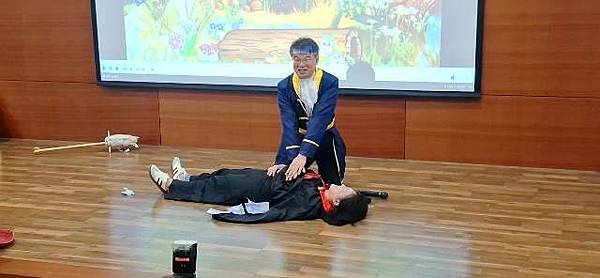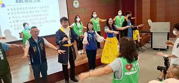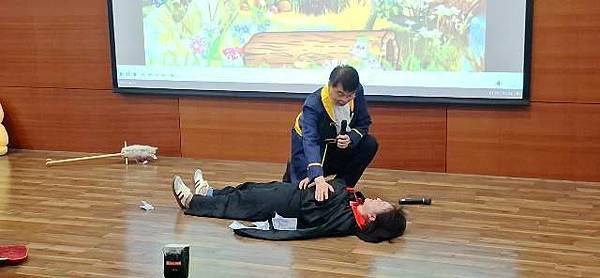 許秉毅副院長為活動致詞表示,適時的急救不僅能減輕傷害,更可能挽救生命。隨後,主辦單位以生動的「急救短劇-蘋果奶奶搶救記」拉開序幕,透過戲劇演繹意外場景,讓與會者直觀感受急救的重要性。接下來,黃瓊燁老師與ABC帶動唱團隊帶領全體參與者共跳「急救之歌」,以活潑的方式傳授急救口訣,加深記憶。