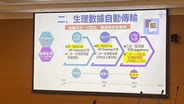 第二,生理數據自動傳輸設備升級,每位護理師均配備專屬傳輸設備,量測之資料即時傳回系統,提升準確度,也節省手動輸入時間,實現「量測一次到位」的照護效率。
