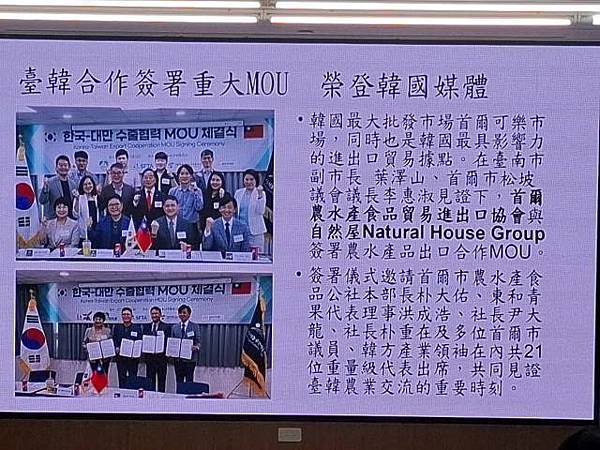 此外,在台南市副市長葉澤山及松坡區議會議長李惠淑見證下,首爾農水產食品貿易進出口協會與 Natural House Group 於韓國最大批發據點可樂市場簽署出口合作 MOU,現場聚集多位首爾市議員及產業領袖,見證雙方合作的重要時刻。依據協議,韓方將大規模採購台南芒果、蜜棗、鳳梨、荔枝等優質農水產品,訂單總額達新台幣1億元,未來將供應至可樂市場、樂天百貨及韓國前三大連鎖超市,不僅可提升台南農產品在韓國市場的能見度與市佔率,更展現台南農水產品牌形象,為深化台韓農業貿易交流奠定堅實基礎,開創永續合作新契機。