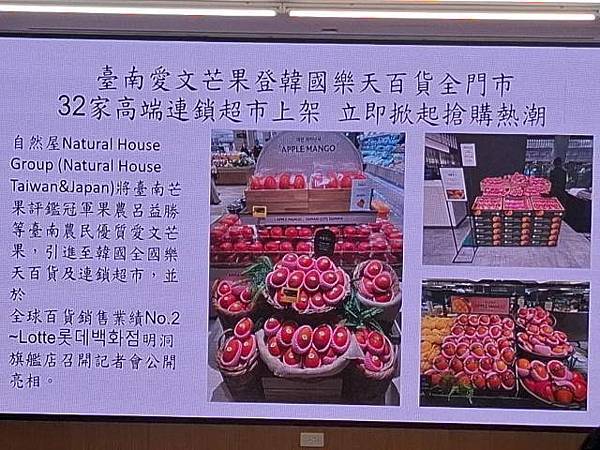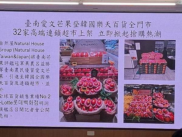 【柿子日報記者李玲/台南報導】台南市政府近年努力推展愛文芒果、鳳梨等農水產進軍韓國市場,成果相當豐碩,包含韓國食品展期間成功促成近新台幣2億元商機,以及在韓國首爾可樂市場完成重量級MOU簽署,拿到高達1億元的農水產採購訂單,為台南農產拓展韓國市場再創高峰。