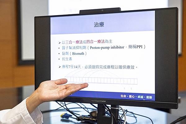 住院後安排胃鏡檢查,發現十二指腸潰瘍出血,醫療團隊立即進行腎上腺素注射及雙極電燒止血術,病情逐漸穩定。3日後進行胃鏡追蹤檢查,顯示潰瘍已止血,而胃部呈現結節性胃炎,病理切片及幽門桿菌檢查結果均顯示為幽門桿菌感染。依據藥物敏感性測試結果,病患接受四合一抗生素療法治療後,症狀完全改善。