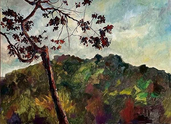 洪俊銘的風景畫展現「山岩」的氣息和藍天、白雲、天地的廣濶。以油畫為主要創作媒材的他,筆觸樸質厚實,蘊含堅定與沉穩的力量。他在構圖間留下線索,這些線索同一個個未說完的事件——邀請觀者將自身的記憶與感受投射進來。畫面展現出筆的舞與力度,也保留了完整的沉思的空間,如同岩石與水的共存,既守護也包容。在真摯的風景裡,情感真誠留駐。它們靜靜停泊——停泊在一抹晨光、一片霧氣、一張遠去的背影之中。
