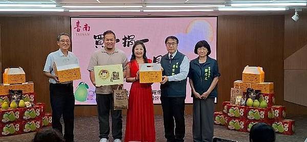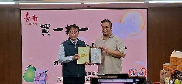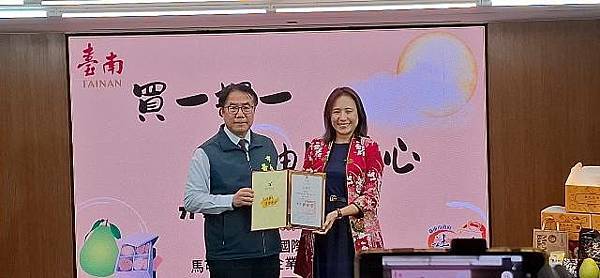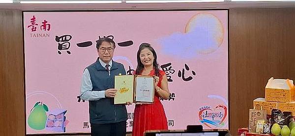 【柿子日報記者李玲/台南報導】為響應南市府照顧弱勢為優先之理念,有「青果西施」美名的台南市百業國際矅進學會創會理事長顏嘉縈,每逢中秋佳節皆發起「文旦禮盒買一捐一」公益活動,至今已連續辦理5年,今(114)年更攜手馬可先生食品企業股份有限公司,共同捐贈1,000盒禮盒(內含文旦及餅乾)給台南市弱勢家戶。今(19)日於永華市政中心舉行捐贈儀式,由市長黃偉哲代表受贈並回贈感謝狀。