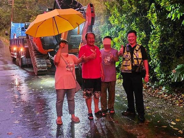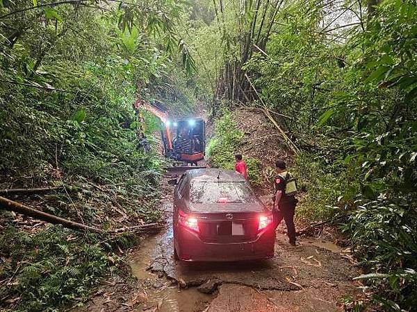 白河警分局獲報後立即派員趕赴。關嶺所所長楊昆達、警員林倉綾冒著傾盆大雨沿線搜尋,儘管山區道路濕滑、視線不佳, 「仍不畏艱險,終於在杭內電線桿編號大林85附近尋獲受困夫妻。 「當時雨勢持續不斷且車輛深陷泥濘無法僅靠人力脫困,楊等2員 「一面安撫夫妻情緒,一面緊急聯繫大林里里長調派大型挖土機支援。