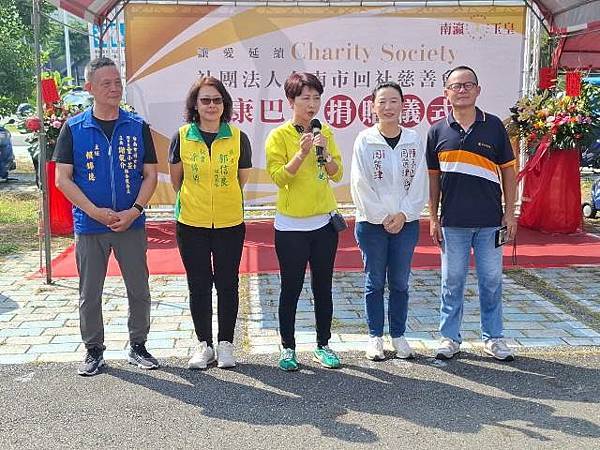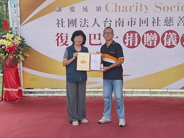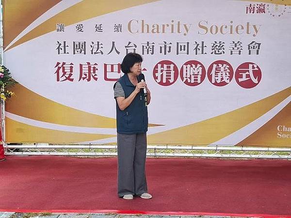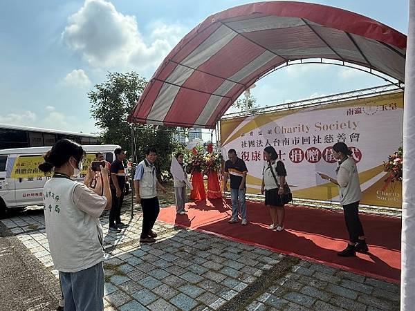 【柿子日報記者李玲/台南報導】為響應臺南市照顧弱勢優先的施政理念,社團法人台南市回社慈善會捐贈1輛復康巴士,今(21)日由現任理事長吳建智及多位榮譽理事長代表於大興公園停車場出席捐贈儀式;由社會局郭乃文局長親自出席代表接受並回贈感謝狀。陳亭妃立委、陳怡珍議員、周麗津議員、李中岑議員本人以及立委林俊憲、謝龍介、王定宇、邱莉莉議長、巿議員郭信良及蔡宗豪等服務處代表和北區區公所潘寶淑區長也到場參與見證。