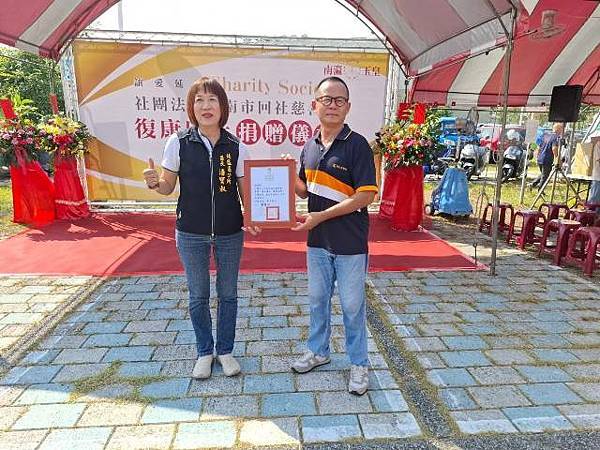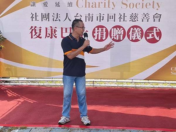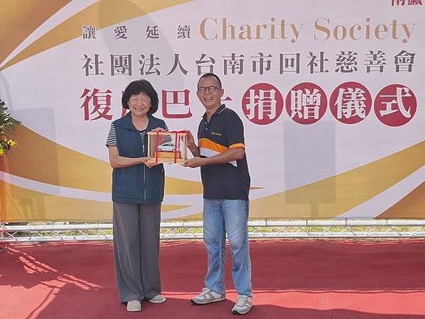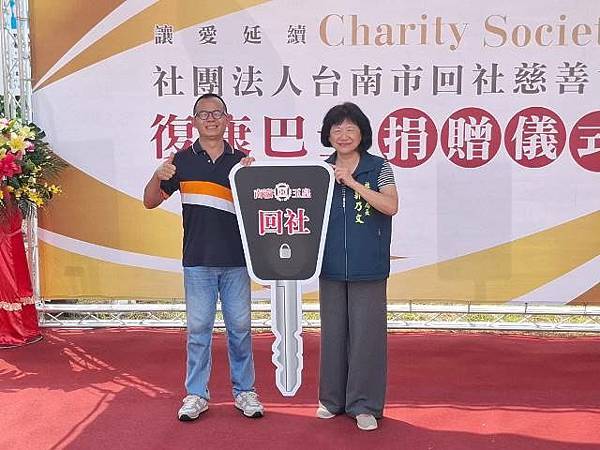 社團法人台南市回社慈善會長期深耕地方公益,除捐助沿海偏鄉學校獎助學金外,亦於丹娜斯颱風災後發放物資與愛心餐食,並配合里長共同關懷受災戶;每年9月更持續辦理捐血活動,以實際行動回饋社會。而繼103年捐贈1輛復康巴士、106年捐贈長照社區巡迴接送車後,本次配合捐血活動第2度捐贈復康巴士,與市府攜手守護身障朋友的交通需求,期盼鼓勵更多善心人士與企業投入社會公益行列。