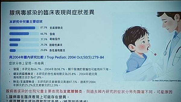 檢驗技術的進步多套式聚合酶PCR檢測技術可同時進行多重病原體檢測,使得合併感染的確認變得更為快速而精確,這可能解釋了本院與國內一篇2004年研究,在症狀盛行率上的差異。例如,住院個案中主要症狀為支氣管肺炎(87.5%)和發燒(66.7%),而過去研究的發燒比率則高達98.7%,肺炎25.2%及支氣管炎的12.9%。這一差異可能與檢測技術的進步有直接關係。人類鼻病毒/腸病毒的高度共感染率,兩者可能存在協同致病機制,後續可以更深入研究)。