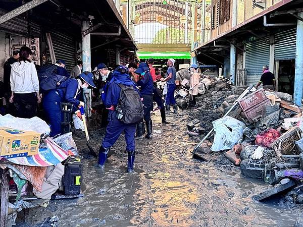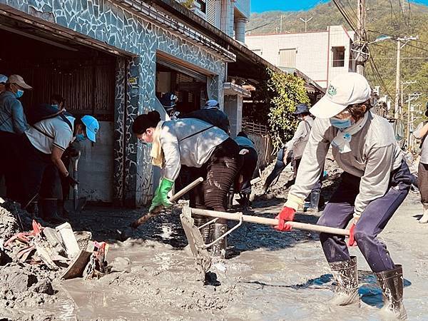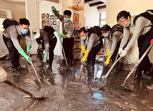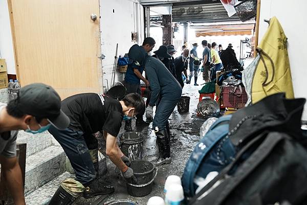 「需要水嗎?」「有人需要便當嗎?」「你們有需要清掃嗎?」許多單位與愛心人士、團體投入救災工作,有的送餐、有的送水,更有許多人加入清掃,重機械不斷開進災區清淤,愛心人士與汽車進入災區川流不息,人們互相提醒注意安全。