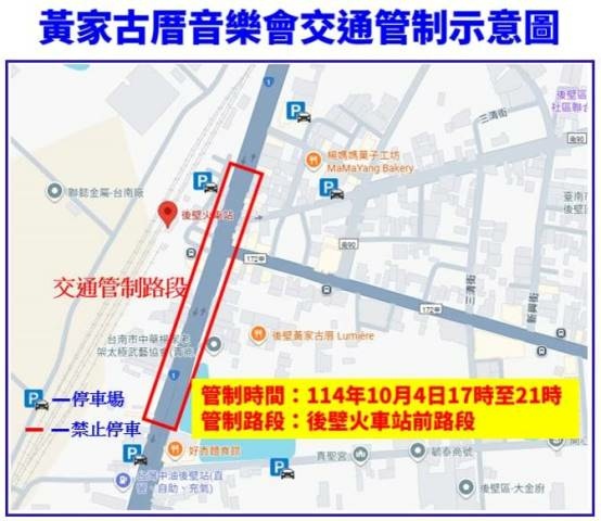 【柿子日報記者林易緒/台南報導】一年一度的「後壁黃家古厝音樂會」將於十月四日(六)晚間七時在百年古厝前隆重舉行。為確保活動順利進行,臺南市政府警察局白河分局規劃周全勤務,針對會場及周邊道路實施交通管制與疏導,並加強治安維護,保障民眾安全。