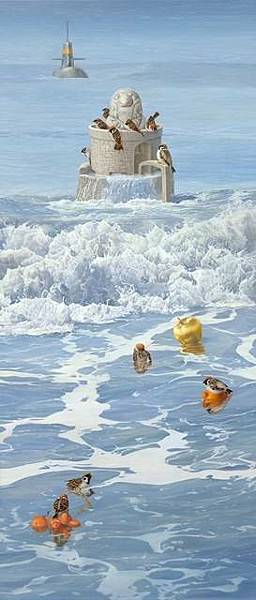 嚴靖傑的〈未來漂流〉系列,以寓言式敘事呈現動物在陌生時空中的漂泊旅程,折射人類面對環境變遷與命運未知的焦慮與思索。作品中那片未知的「白色星球探勘計畫3」,更在展出前即被藏家收藏,顯見其創作中寓含的未來想像與哲學思辨,深受市場與藏家關注。或許正是對未來「家」的重新定義——一個仍在被書寫的可能世界,又或是「宇宙海洋觀測站」這件作品,幻想三百年後的未來,地球多數地區已不適居,人類遷往外太空生活。