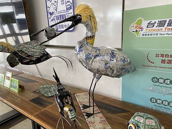 【鋁罐人】鋁罐黑琵水雉-李家琦藝術家表示,民國90年前往土城聖母廟,無意間發現一位老翁以廢棄鋁罐製做沙發,也迷上了鋁罐創作,黑面琵鷺鋁罐創作有平面及立體,如採魁儡方式製做魁儡黑琵、加個時鐘的時鐘黑琵、小小兵黑琵、黑琵帽、黑琵機車等,今年再嘗試創作台南市鳥水雉,共20餘件作品參展,也有龍蝦、魚、螃蟹、章魚;歡迎大家踴躍前往觀賞作品,來個難忘的「琦幻之鋁」